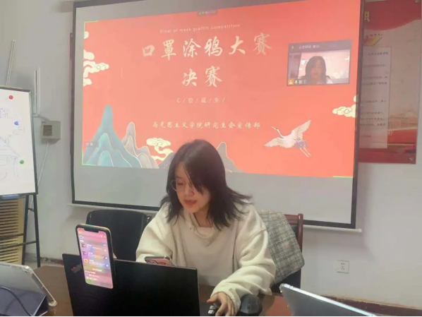本次活动共分为两个阶段。前期通过线上投票的方式,对47位同学的参赛作品进行了评选,经过为期两天的激烈角逐,15个优秀作品进入了本次活动的决赛。后期决赛共分为三个环节。首先,此前的线上投票中脱颖而出的15名同学,依次对自己作品的立意做了详细讲解,并由同学们进行了投票。然后,在“你画我猜”环节中,每位参赛选手在规定时间内画出指定的内容,并交由同学们进行猜测,被猜中的越多即可获得越高的分数。最后,根据线上投票、口罩立意讲解投票以及“你画我猜”环节得分,评选出本次活动的各种奖项。