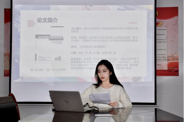 本次讲座由2020级马克思主义理论专业的马欣宇同学主讲。马欣宇同学首先对本次讲座的内容来源进行了介绍,说明了此次讲座的内容来自于翁建明教授发表于期刊《公司党建与思想教育》上的一篇学术论文。随后,她指出此篇学术论文主要以习近平新时代中国特色社会主义思想为指导,从教学理念转变、教学模式创新和教师角色转换等维度,探讨了移动互联背景下高校思政课员工参与式教学改革的若干问题。最后,她从“以教师为中心”转向“以员工为中心”的理念转变,“教学分离”转向“教学融合”的模式更新,“知识权威”转向“学习导师”的角色转换三个方面阐述了改革中出现的各种问题。