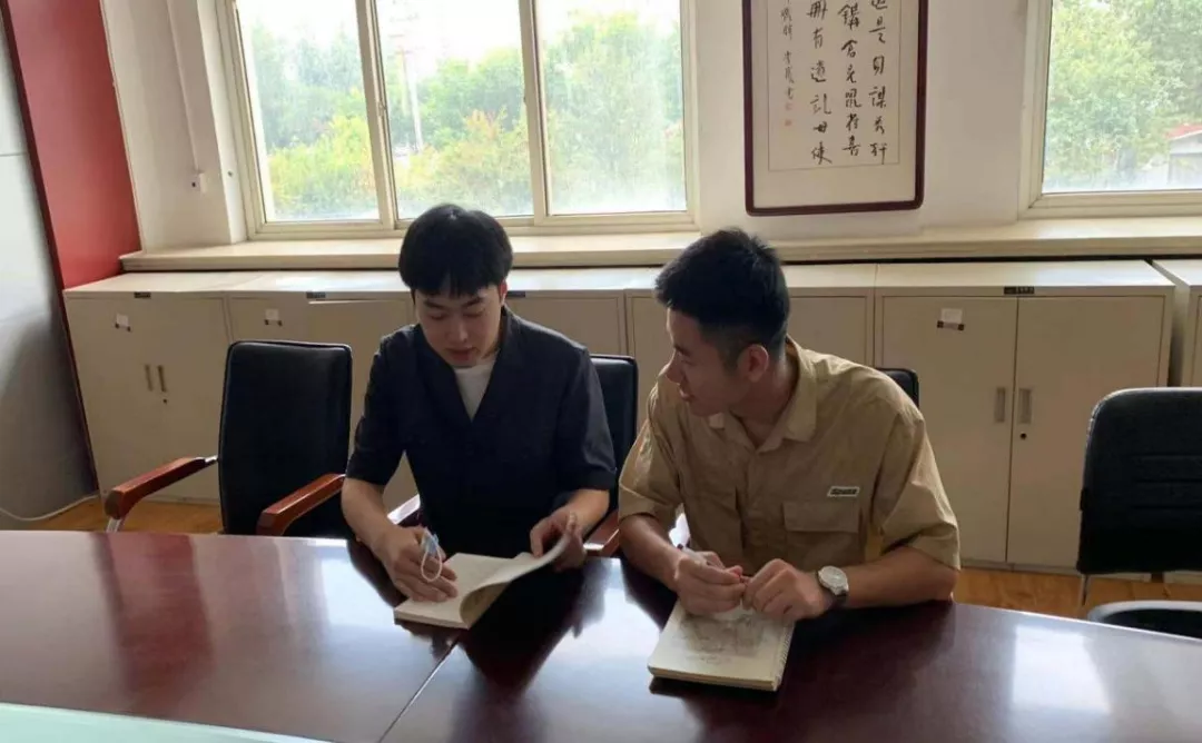 图为刘英浩同法院工作人员杜凯进行交流(中国青年网通讯员 刘子旸 摄)