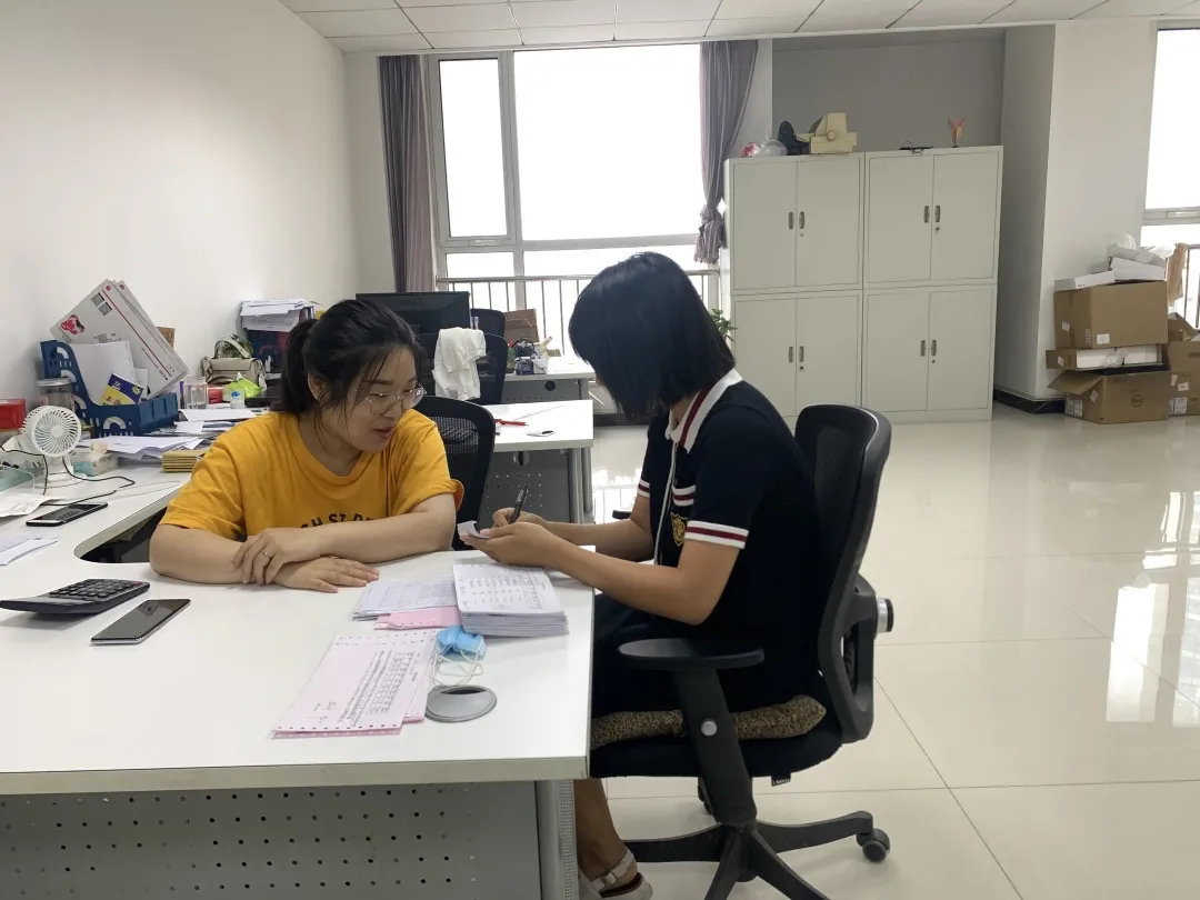 图为实践队员宣讲完后与该企业财务部门一名会计人员交流学习体会 (中国青年网通讯员 兰芸芸摄)