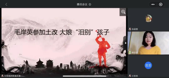 宣讲活动第八讲,由2020级马克思主义伦理学专业韩世佳同学讲述了“毛岸英参加土改,大娘泪别‘孩子’”的故事:1947年7月,中共中央工委在西柏坡召开了全国土地会议,并通过了《中国土地法大纲》。之后,中央决定让毛岸英到农村一线参加“土改整党运动”并派遣其至张家集村开展工作。毛岸英来到张元林大爷家后,始终把自己当作“普通一兵”,一有空便帮着干挑水、扫地等杂活,并经常帮助众乡亲解决困难。因此张大娘十分感动,待他像亲儿女一样,没几天就亲切地叫他“孩子”了。1948年5月,中央电令毛岸英调离张家集村。当乡亲们得知“杨同志”要走的消息时,都纷纷前来与他道别。张大娘一家与乡亲们冒着雨簇拥着他来到村头,毛岸英含泪告别张大娘和其他乡亲,依依不舍地走上了汽车。当汽车远远离去后,张大娘仍站在雨中,挥泪相送……通过韩世佳动人的讲述,线上的每一位同学都深切感受到了像毛岸英这样的中国共产党人的朴实、亲和。