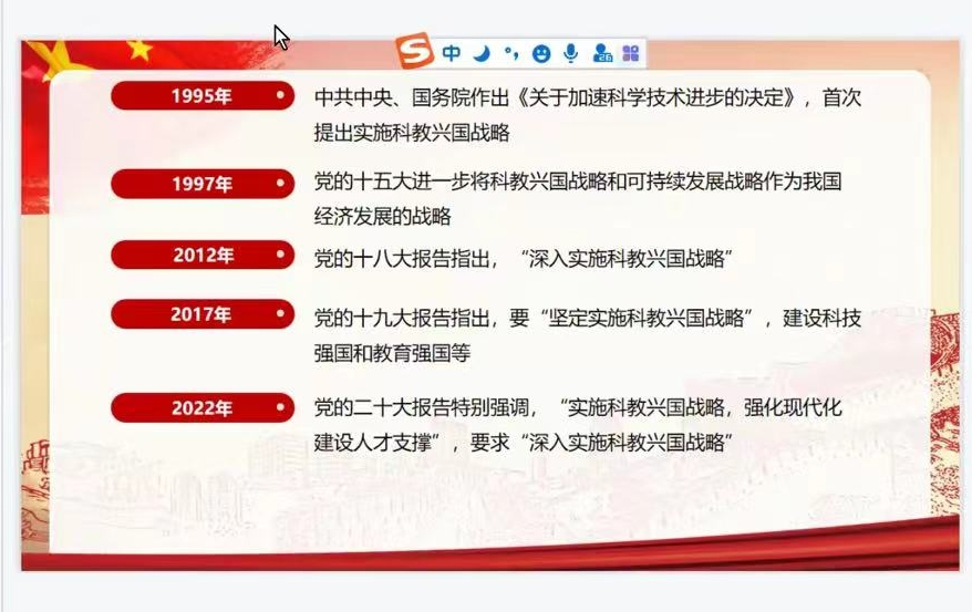 11月26日晚,公司研究生会“悦读二十大,奋进新征程”学习贯彻二十大精神系列活动第三期在线上举行。系列活动第三期以实施“科教兴国战略,强化现代化建设人才支撑”为主题,共有四位主讲人参与主讲,第四讲主讲人为2022级马克思主义理论专业研究生蔡亚荣,全院62名研究生参加了此次活动。