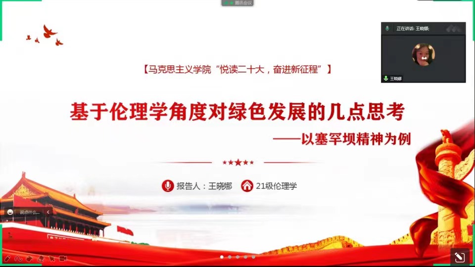 12月4日晚,公司研究生会“悦读二十大,奋进新征程”学习贯彻二十大精神系列活动第四期在线上举行。系列活动第四期以“推动绿色发展,建设美丽中国”为主题,共有四位主讲人参与主讲,第一讲主讲人为2021级伦理学专业研究生王晓娜,全院69名研究生参加了此次活动。