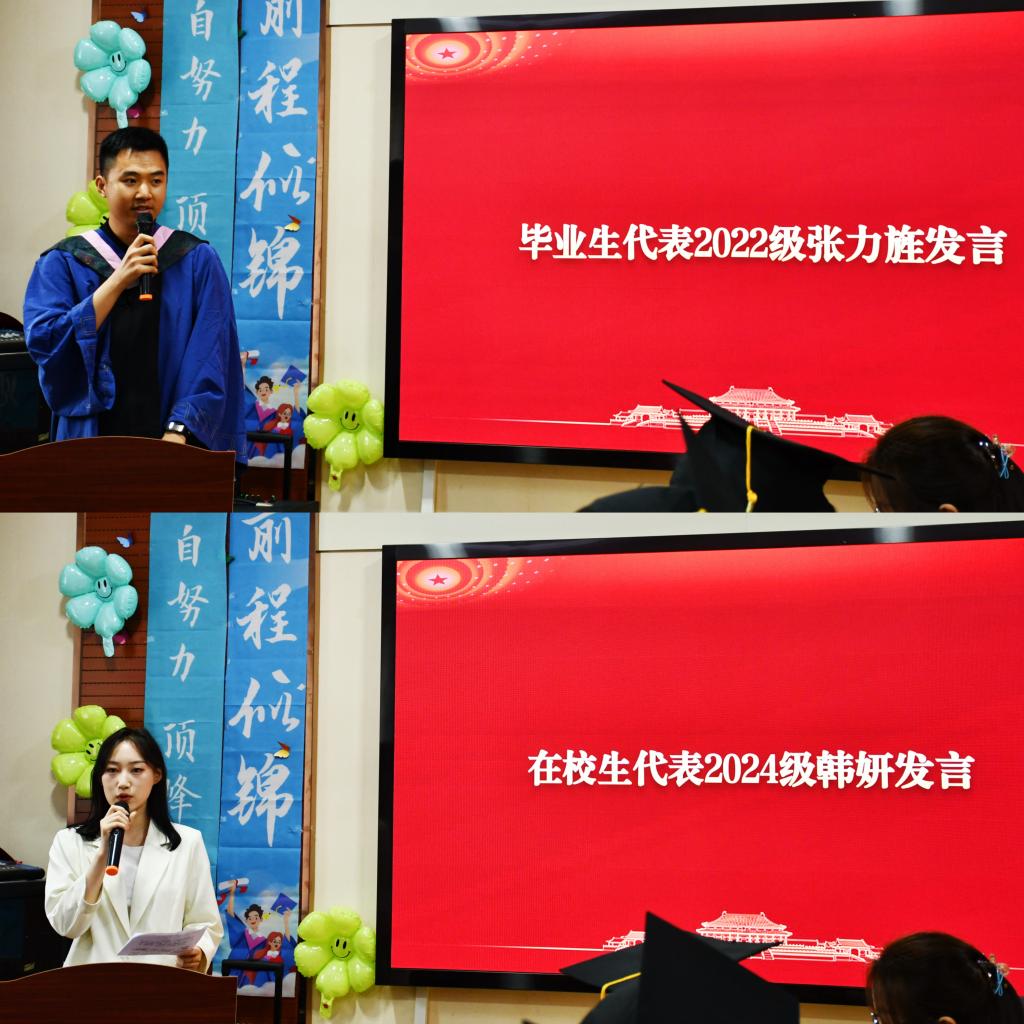 毕业生代表2022级张力旌回顾了难忘的研究生学习,感谢公司的悉心培养,感恩老师们的耐心教导,立志做有理想、敢担当、能吃苦、肯奋斗的新时代好青年。在校生代表2024级韩妍祝贺学长学姐们顺利毕业,祝愿学长学姐们在未来人生道路上意气风发、豪情满怀。